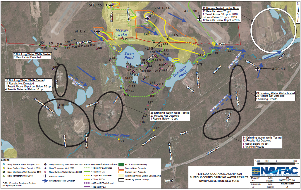 None of the former or current Navy property in Calverton is located upgradient of SCDHS sampling areas 4 and 5. The groundwater in these sampling areas actually flows toward Navy property so there are no known or potential Navy PFAS release areas that could have resulted in PFOS/PFOA in the drinking water wells sampled by SCDHS. The Navy’s former property south of the Western Runway is located upgradient of SCDHS sampling areas 1, 2, and 3. The Navy’s investigation to date has not identified a PFAS release in this area. To be proactive, the Navy collected groundwater samples along Swan Pond Road to confirm that a release has not occurred, which could have the potential to impact drinking water wells.