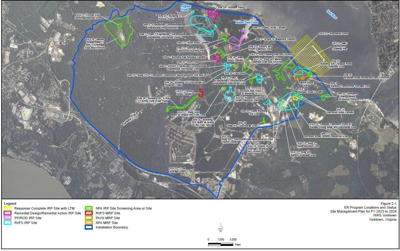The map below shows the Active and No Further Action (NFA) sites included in the Environmental Restoration Program (ERP), as well as the Munitions Response Program (MRP) at NWS Yorktown. Active ERP sites that are currently undergoing investigation and have not been closed include Sites 1, 3, 6, 7, 8, 9, 12, 19, 22, 23, 24, 25, 26, 31, 33, and 34. Active MRP sites that are currently undergoing investigation and have not been closed include UXO-2 (formerly Site 2).