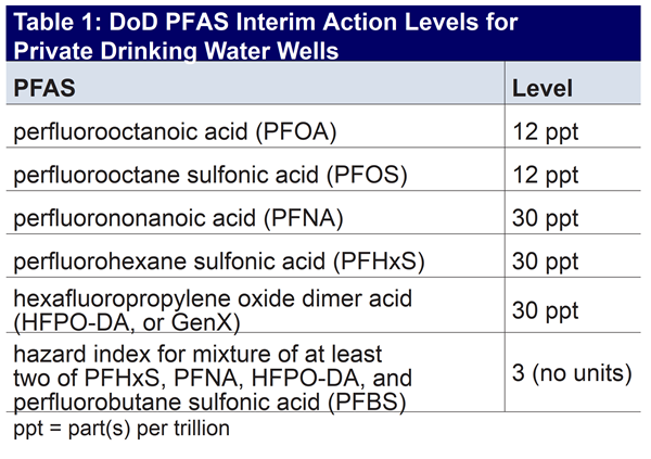 Table 1 presents the DoD levels for PFAS in private drinking water wells. The DoD’s September 2024 memorandum can be found here. To learn more about the DoD’s September 2024 memorandum, the November 19, 2024 DoD PFAS Outreach Event can be found here.