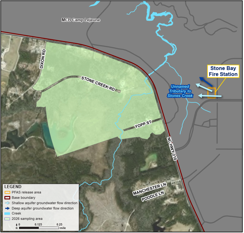 The Navy and Marine Corps detected certain PFAS in groundwater at MCB Camp Lejeune, including the Midway Park Fire Station and Stone Bay Fire Station (Figure 1). As a result of the detections at these sites, sampling areas (Figures 2 and 3) were established one mile in the direction that groundwater flows away from the sites.