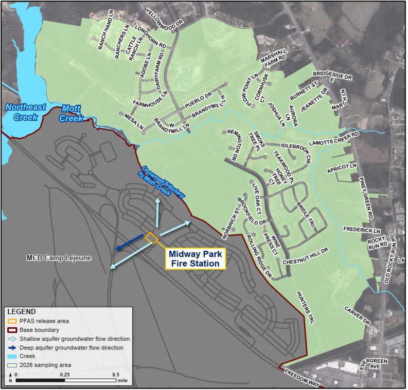 The Navy and Marine Corps detected certain PFAS in groundwater at MCB Camp Lejeune, including the Midway Park Fire Station and Stone Bay Fire Station (Figure 1). As a result of the detections at these sites, sampling areas (Figures 2 and 3) were established one mile in the direction that groundwater flows away from the sites.