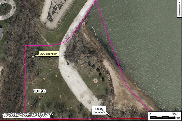 The Site 12 ROD was signed in 2016, and documents a remedy including LUCs. LUCs were implemented in 2017 to restrict future use of the site, prohibit installation of groundwater wells other than for environmental sampling (prohibited by Naval Station Great Lakes Instruction 11130.1 Groundwater Use Restrictions), and require annual inspections of the site to make sure LUCs are continuing to be implemented.