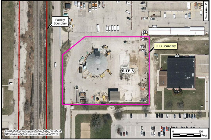 The Site 5 ROD was signed in 2014 which documents a remedy of LUCs to prevent exposure to contaminated soil and prevent groundwater use as a potable source. LUCs were implemented in May 2016 to restrict future use of the site, prohibit installation of groundwater wells other than for environmental sampling (prohibited by Naval Station Great Lakes Instruction 11130.1 Groundwater Use Restrictions), and require annual inspections of the site to make sure LUCs are continuing to be implemented.