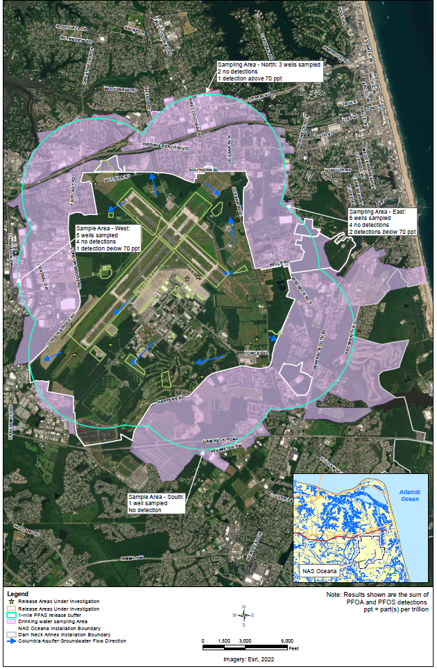 The Navy has conducted drinking water sampling for certain PFAS in drinking water wells in the vicinity of NAS Oceana since December 2016. Table 1 summarizes the drinking water sampling results to date. The Navy continues to evaluate results as new data are collected and will expand the sampling area and conduct actions as needed. When PFOA/PFOS was not detected or was measured at or below 70 ppt in a drinking water sample, no additional action was taken.