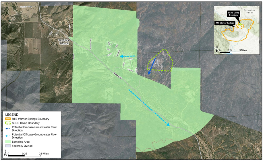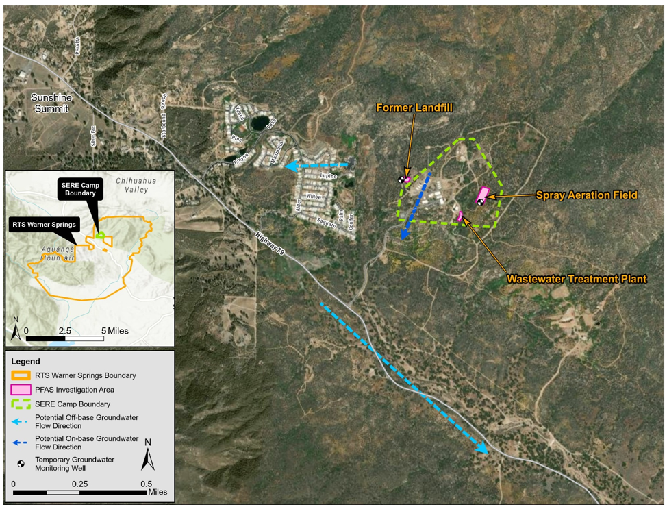 The Navy is conducting further investigations to determine how PFAS may have been released at RTS Warner Springs (Figure 1). However, PFAS are present in the groundwater at Survival, Evasion, Resistance, and Escape (SERE) Camp on RTS Warner Springs (Figure 1) and may be present in nearby drinking water wells that are located in the direction that the groundwater flows away from RTS Warner Springs.