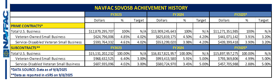 NAVFAC is committed to providing assistance and training SDVOSBs to meeting their needs in doing business with the Navy. Our commitment is demonstrated in an aggressive SDVOSB outreach program, and out steady increase in SDVOSB participation achievements in prime and subcontract award actions. NAVFAC is proud of this record and continues to seek qualified SDVOSB participation in procurement actions.